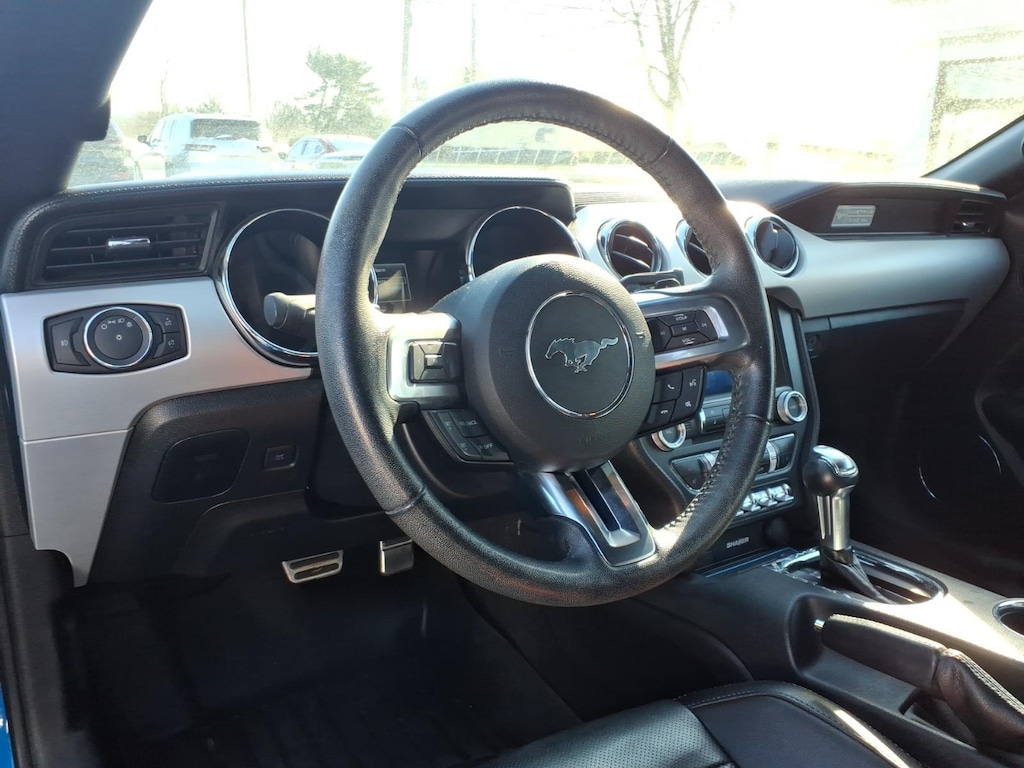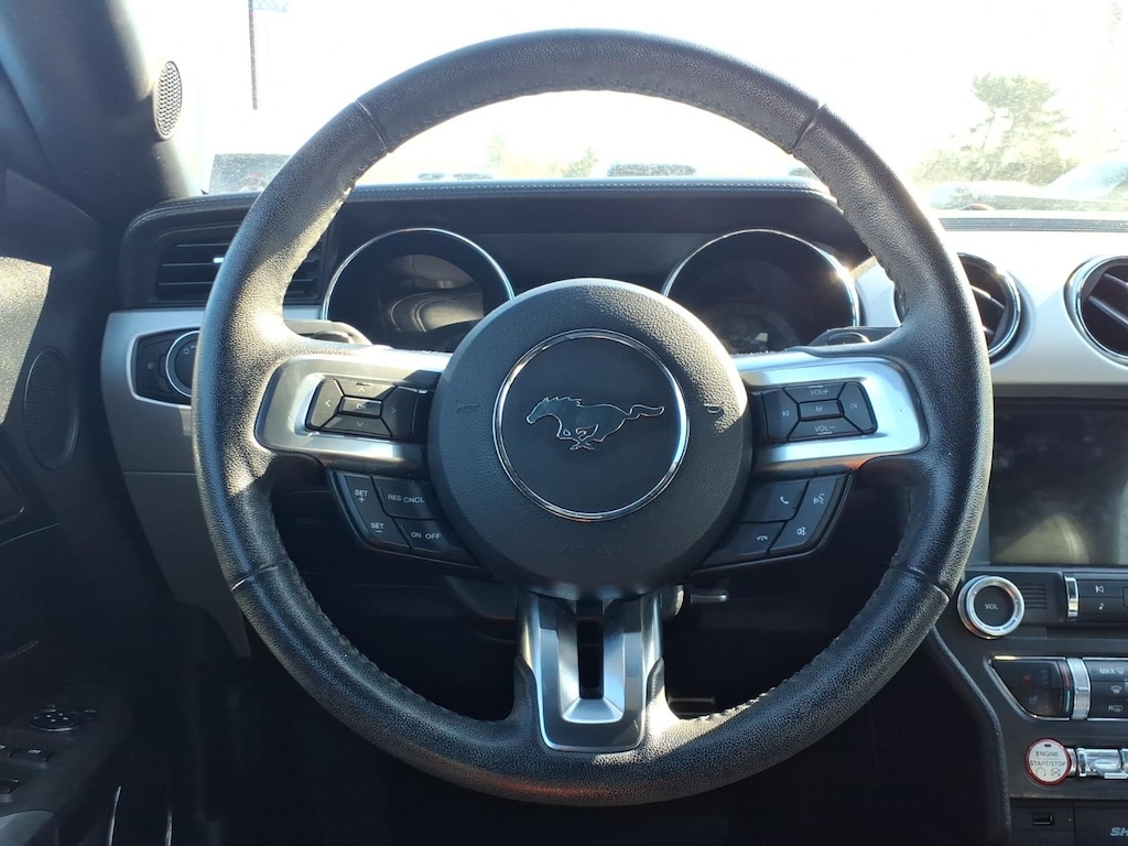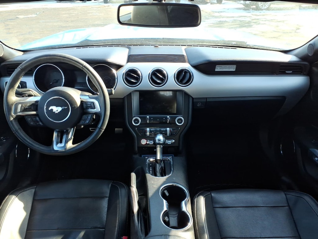 2017 Ford Mustang EcoBoost Premium Vehicle is equipped: Equipment Group 200A, 4-Wheel Disc Brakes, 9 Speakers, ABS brakes, Air Conditioning, Alloy wheels, AM/FM radio: SiriusXM, AM/FM Stereo w/Single CD Player, Auto-dimming Rear-View mirror, Automatic temperature control, Backup Camera, Brake assist, Bumpers: body-color, CD player, Climate Controlled Heated/Cooled Front Seats, Compass, Convertible roof lining, Delay-off headlights, Driver door bin, Driver vanity mirror, Dual front impact airbags, Dual front side impact airbags, Electronic Stability Control, Emergency communication system: 911 Assist, Four wheel independent suspension, Front anti-roll bar, Front Bucket Seats, Front Center Armrest, Front dual zone A/C, Front fog lights, Front License Plate Bracket, Front reading lights, Fully automatic headlights, Garage door transmitter, Glass rear window, Heated door mirrors, Heated front seats, High-Intensity Discharge Headlights, Illuminated entry, Knee airbag, Leather Bucket Seats, Leather Shift Knob, Low tire pressure warning, Occupant sensing airbag, Outside temperature display, Overhead console, Panic alarm, Passenger door bin, Passenger vanity mirror, Power convertible roof, Power door mirrors, Power driver seat, Power passenger seat, Power steering, Power windows, Radio data system, Rear anti-roll bar, Rear window defroster, Remote keyless entry, Security system, SiriusXM Radio, Speed control, Speed-sensing steering, Speed-Sensitive Wipers, Spoiler, Steering wheel mounted audio controls, SYNC 3 Communications & Entertainment System, Tachometer, Telescoping steering wheel, Tilt steering wheel, Traction control, Trip computer, Turn signal indicator mirrors, Variably intermittent wipers, Ventilated front seats, Voice-Activated Touch-Screen Navigation System, Voltmeter, and Wheels: 18 x 8 Magnetic Painted/Machined.